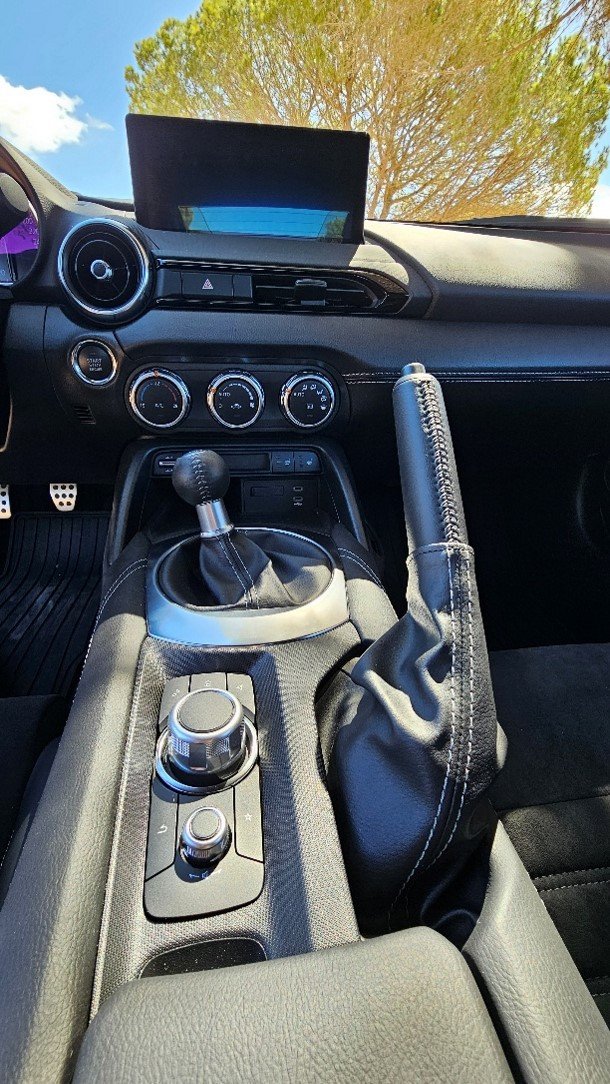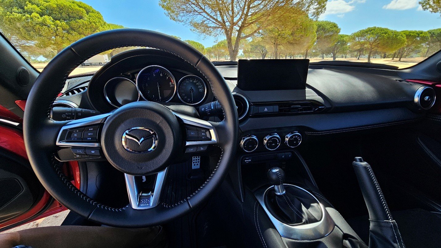 Os detalhes interiores, com acabamentos em materiais de alta qualidade e superfícies suaves ao toque, refletem a atenção da Mazda ao detalhe e à noção de excelência, mesmo neste roadster compacto. O volante, revestido em couro, concede uma pega firme e confortável, e os pedais posicionados de forma ergonómica completam o conjunto, tornando cada aceleração, travagem ou mudança de velocidade, um gesto natural e repleto de prazer.