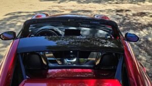 Os bancos Recaro, em couro, oferecem suporte lateral firme, mantendo o corpo estável em curvas rápidas e proporcionando conforto suficiente para viagens mais longas. O assento do condutor é ajustável manualmente, permitindo encontrar facilmente a posição ideal. O espaço interior, embora limitado devido ao perfil compacto do roadster, é inteligentemente aproveitado para maximizar ergonomia e liberdade de movimentos.