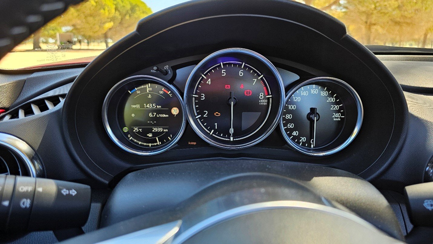 Em termos de consumo, o MX-5 RF 1.5 mantém níveis reduzidos, com média a rondar os 7,0 l/100 km. A segurança é reforçada pelo sistema i-Activsense®, que inclui travagem de emergência autónoma e alerta de saída de faixa.