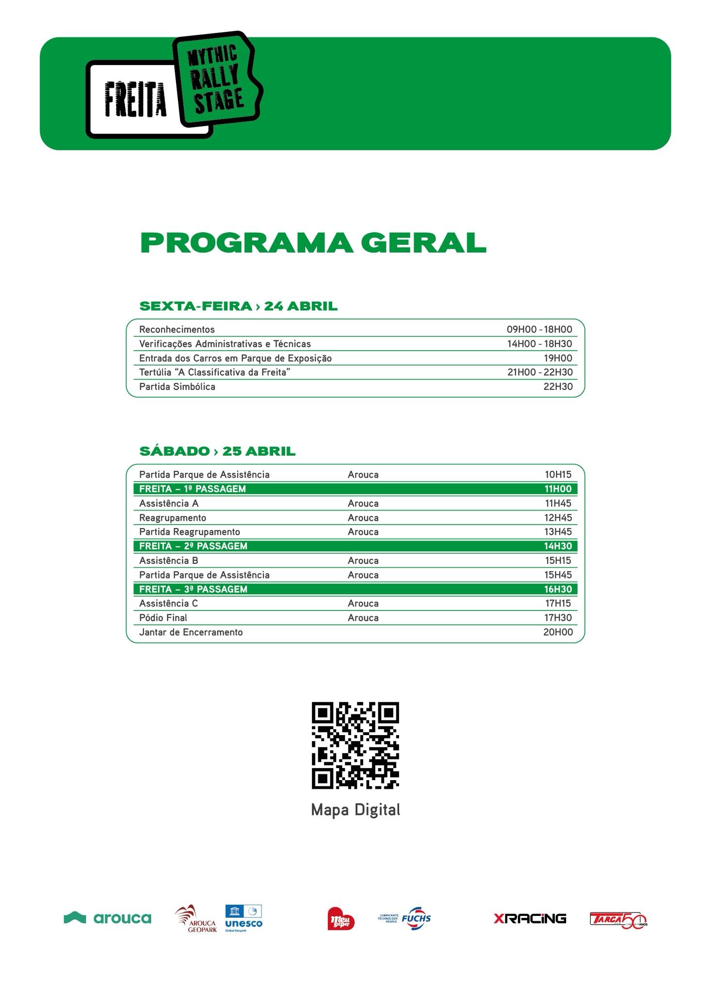 No sábado, 25 de abril, a ação passa definitivamente para a estrada. A partida está marcada para as 10h15, em Arouca, dando início a um dia marcado por três emocionantes passagens pelos 22,6 km da classificativa da Freita, às 11h00, 14h30 e 16h30, momentos-chave do “Freita – Mythic Rally Stage”, que prometem devolver à Serra da Freita o som e a emoção de outros tempos, antes da chegada final, prevista para as 17h30, que tem mais uma vez como palco principal o centro de Arouca.